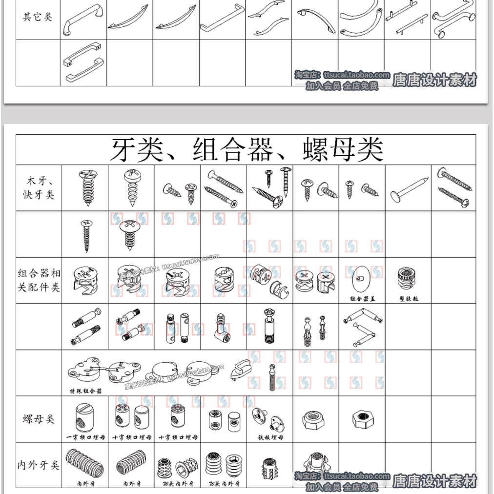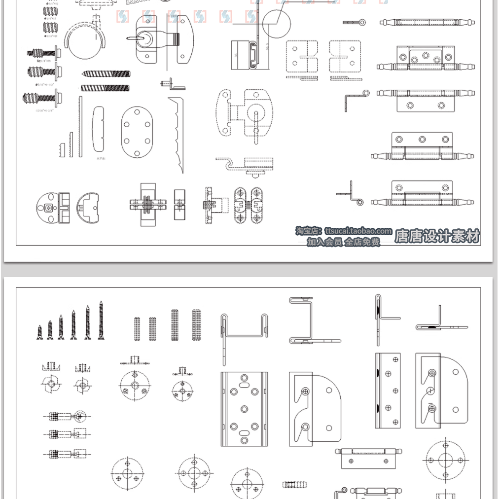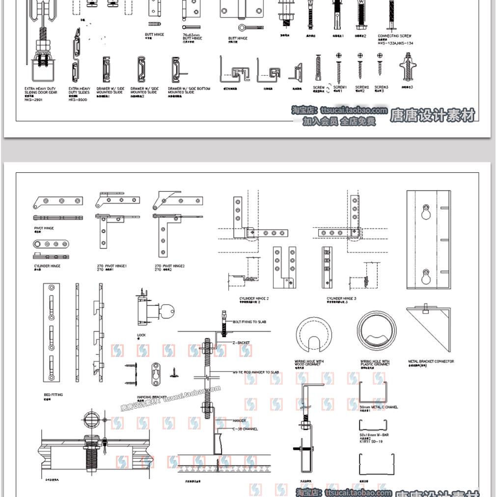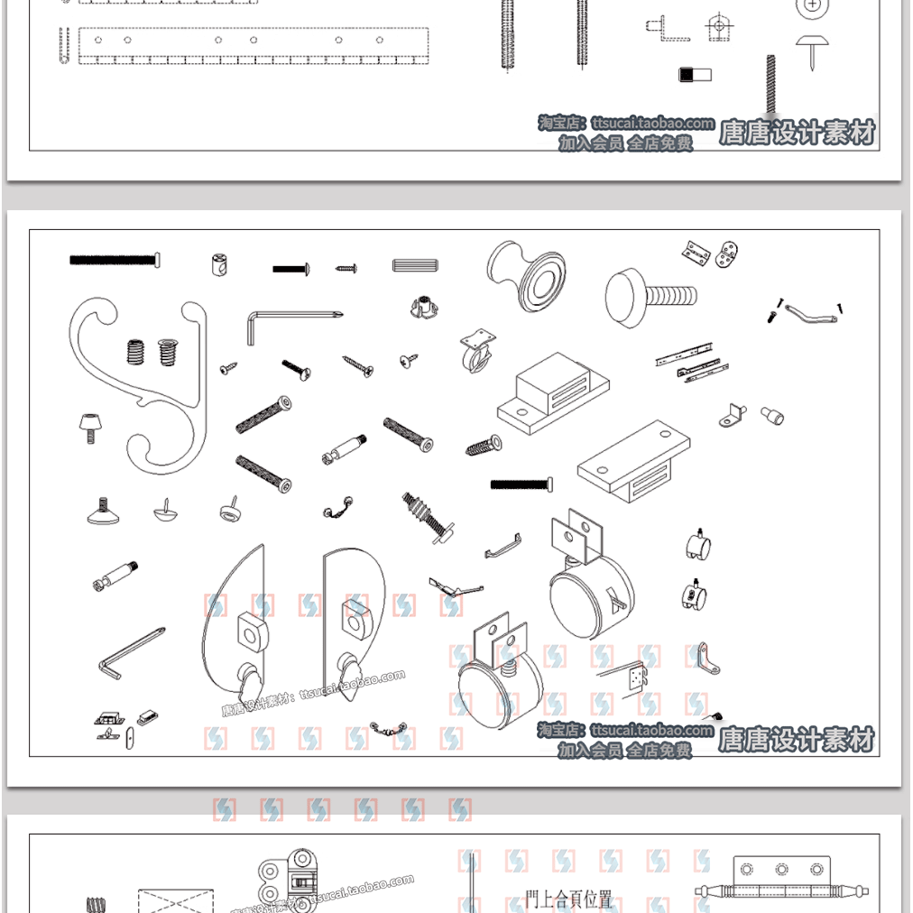 家装家具标准五金零配件图库大全组合器拉手铰链木榫CAD图纸图库免费下载