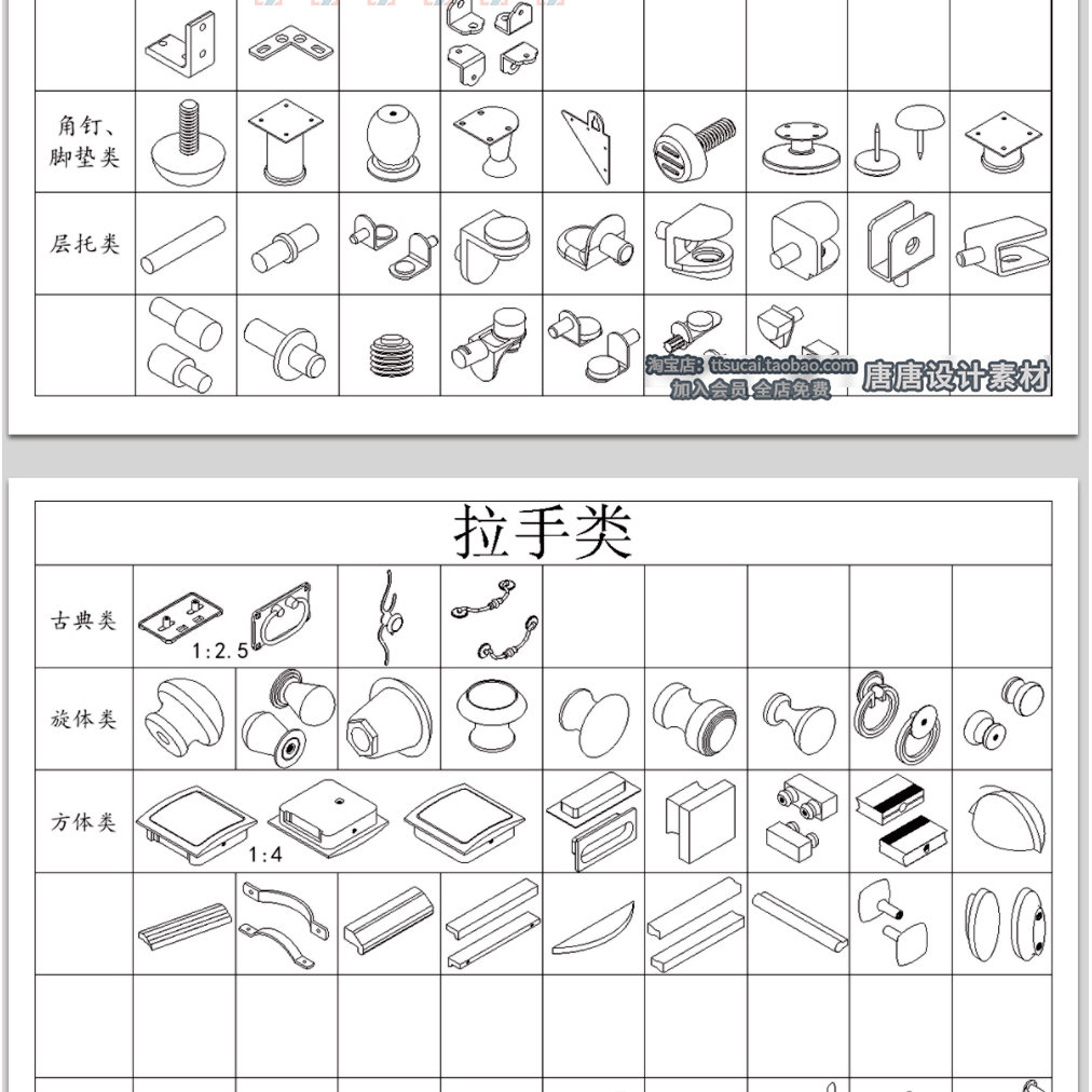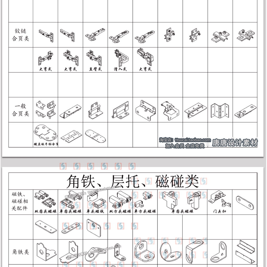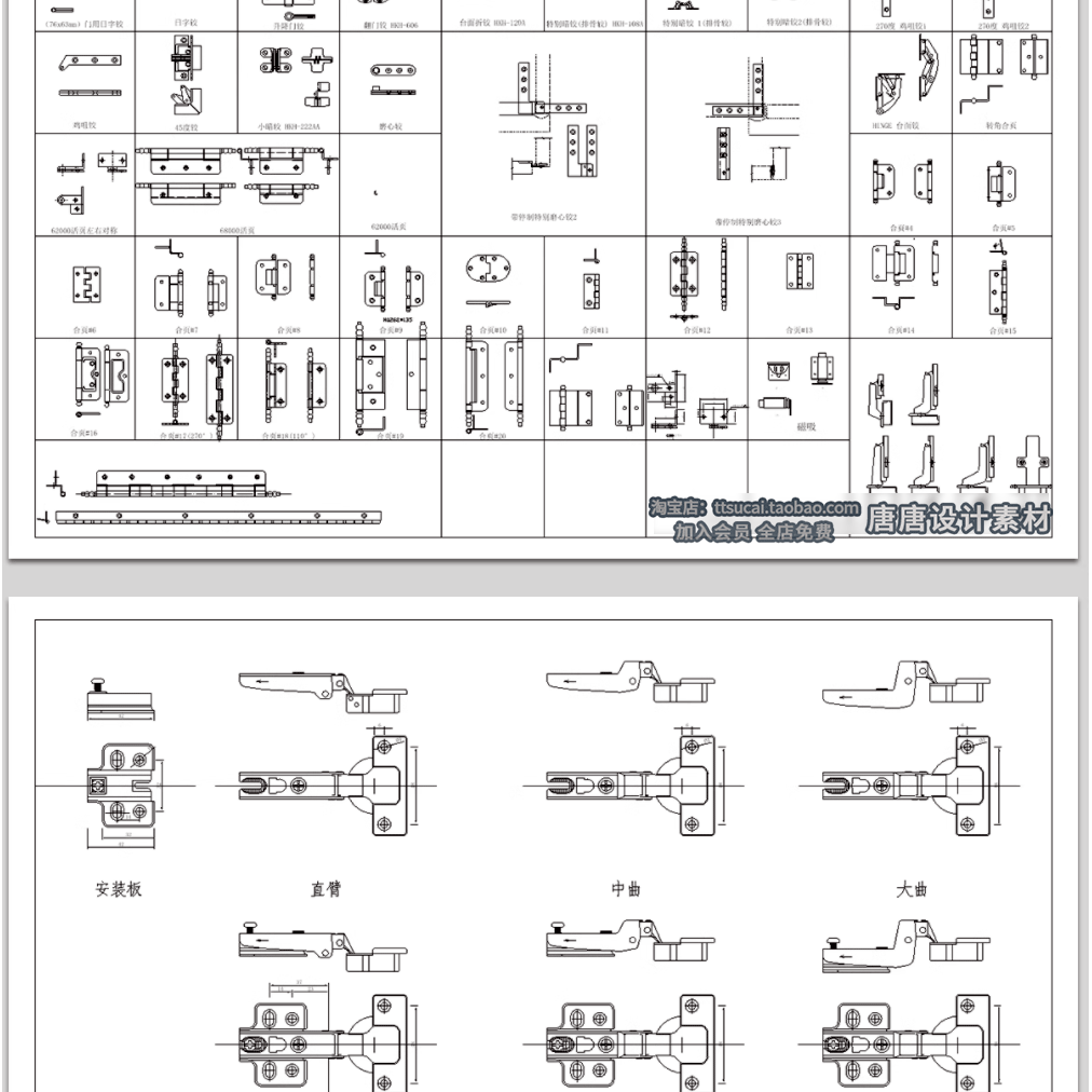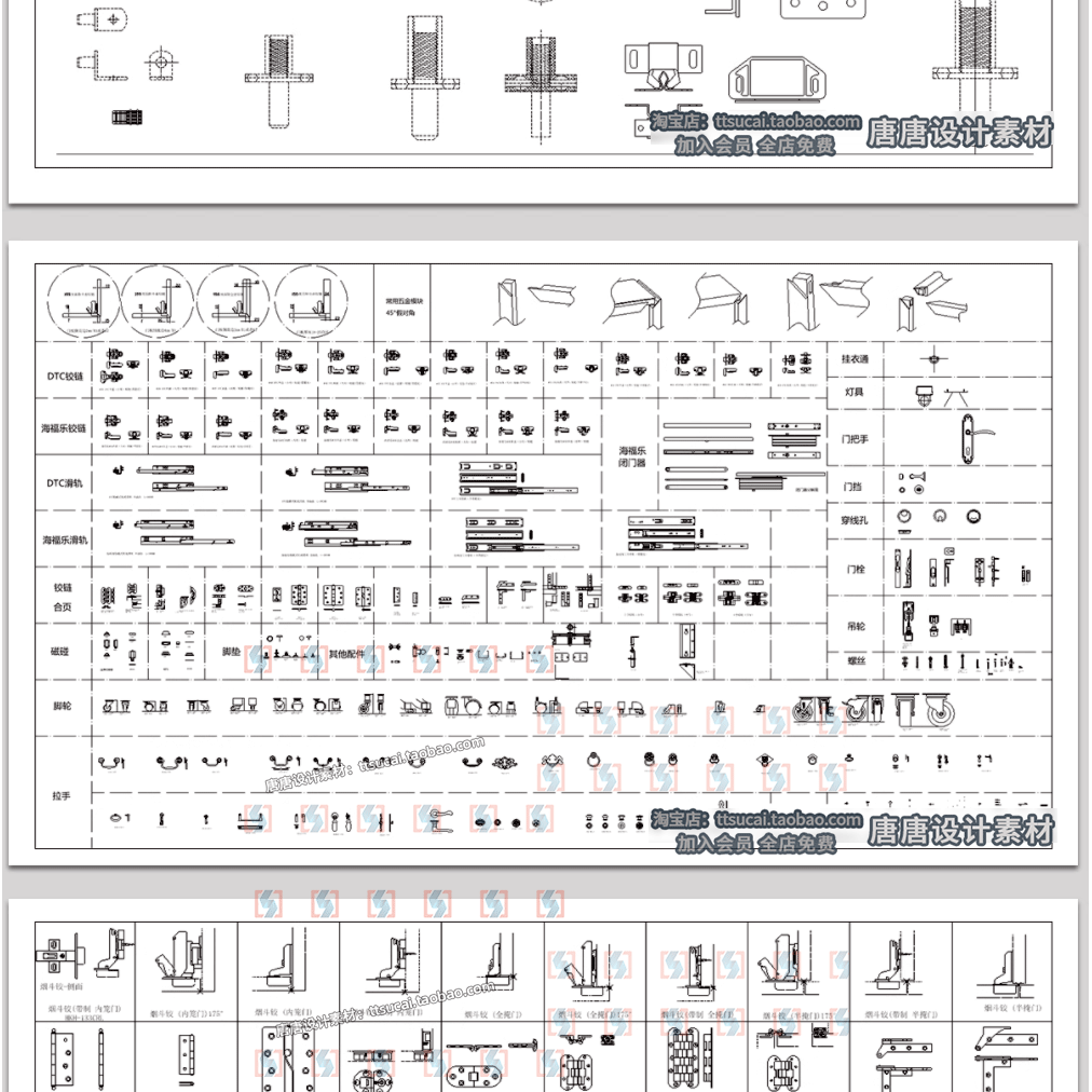 全屋定制五金配件CAD图库 家具柜子拆单图拉手合页铰链零件模块库免费下载
