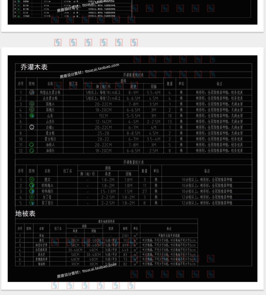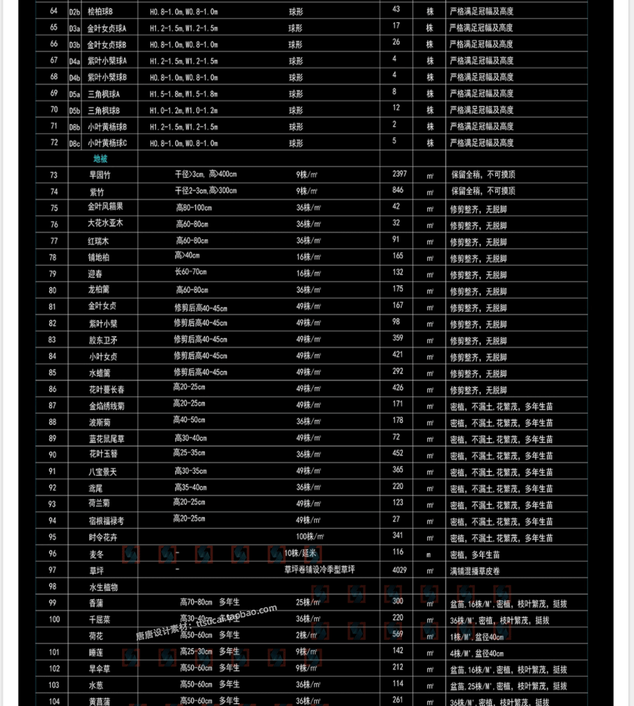 园林景观绿化花境CAD植物配置苗木表地被花卉规格说明表手绘图片免费下载