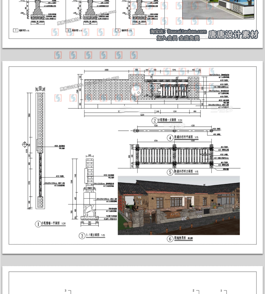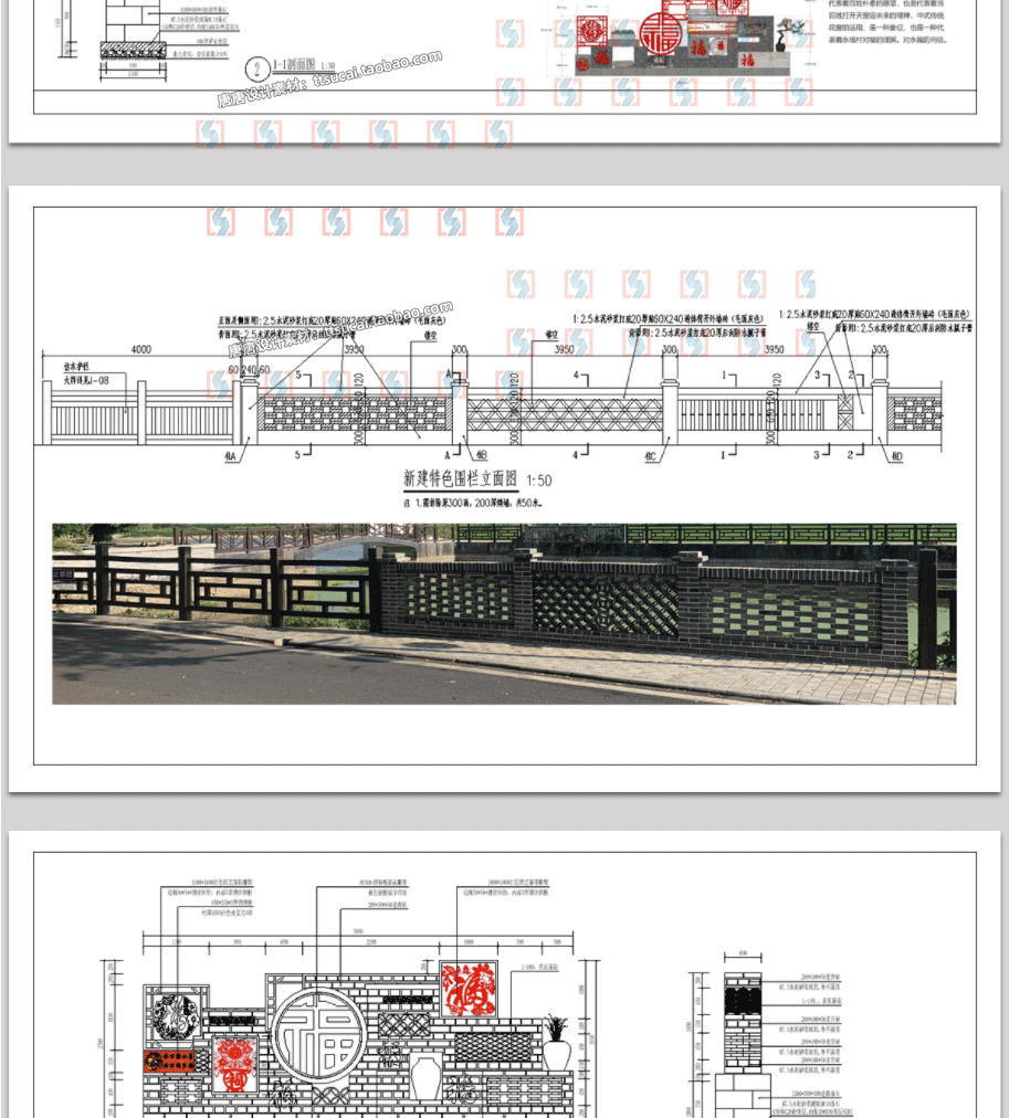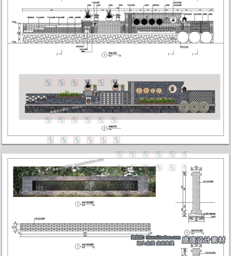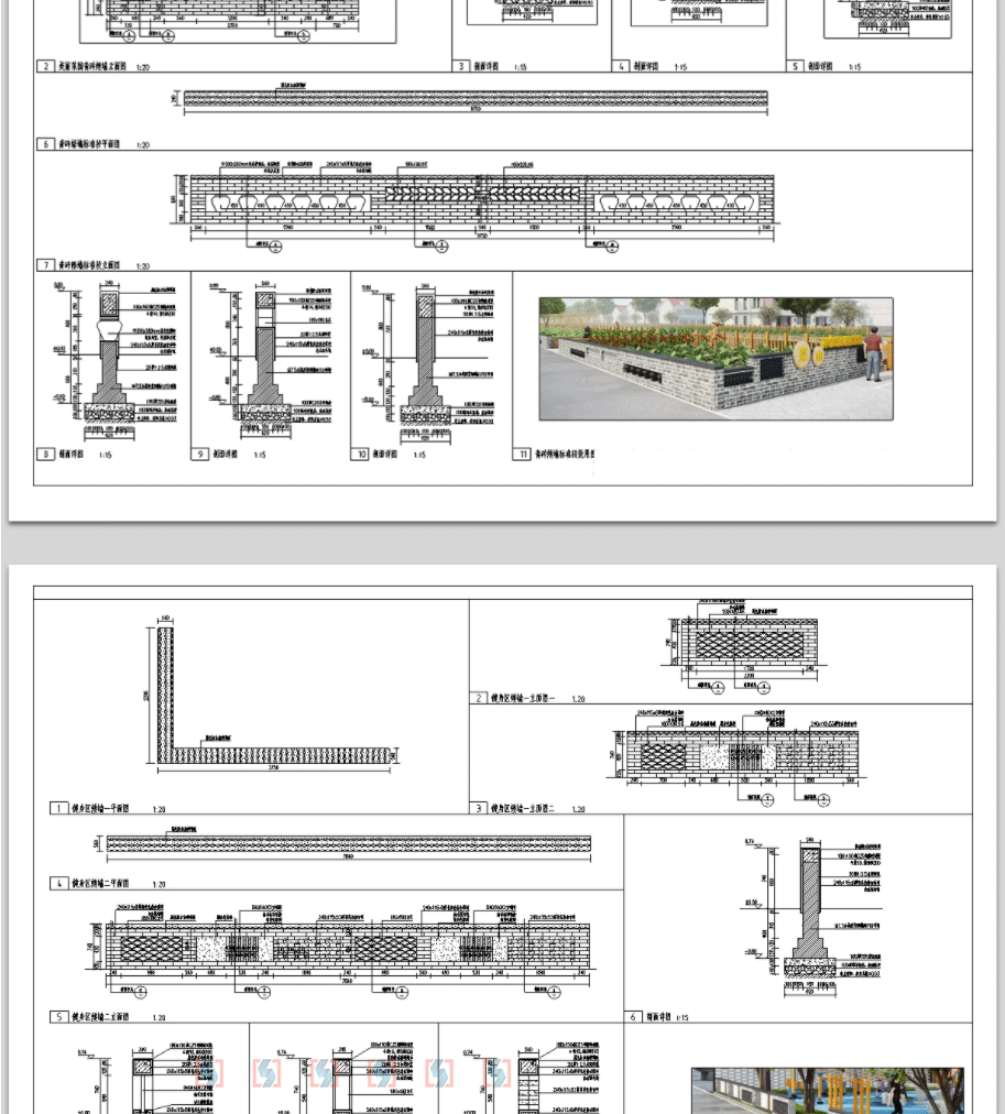 乡村景墙矮墙CAD图纸中式农村青砖围墙菜地围栏做法节点大样详图免费下载