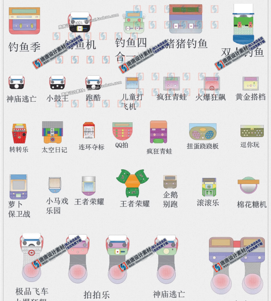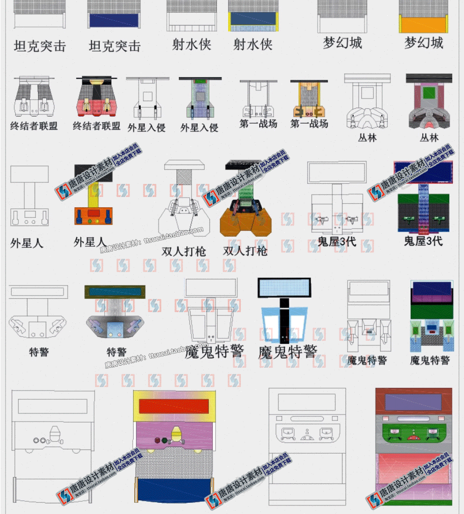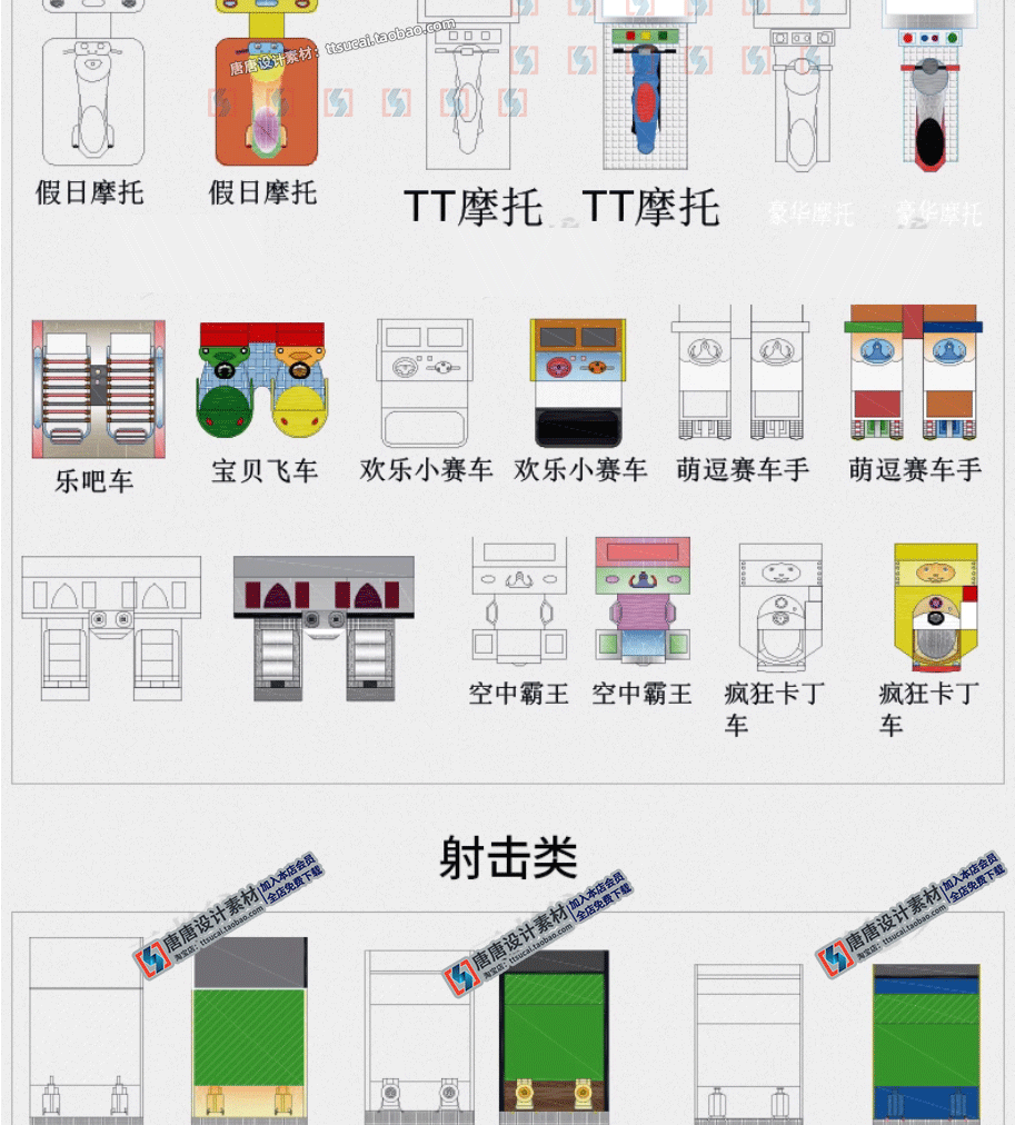 电玩城娱乐设备图库亲子赛车射击钓鱼摇摆礼品机转马CAD平面图块免费下载