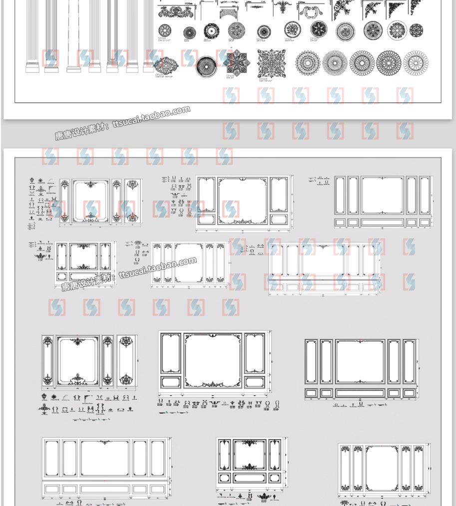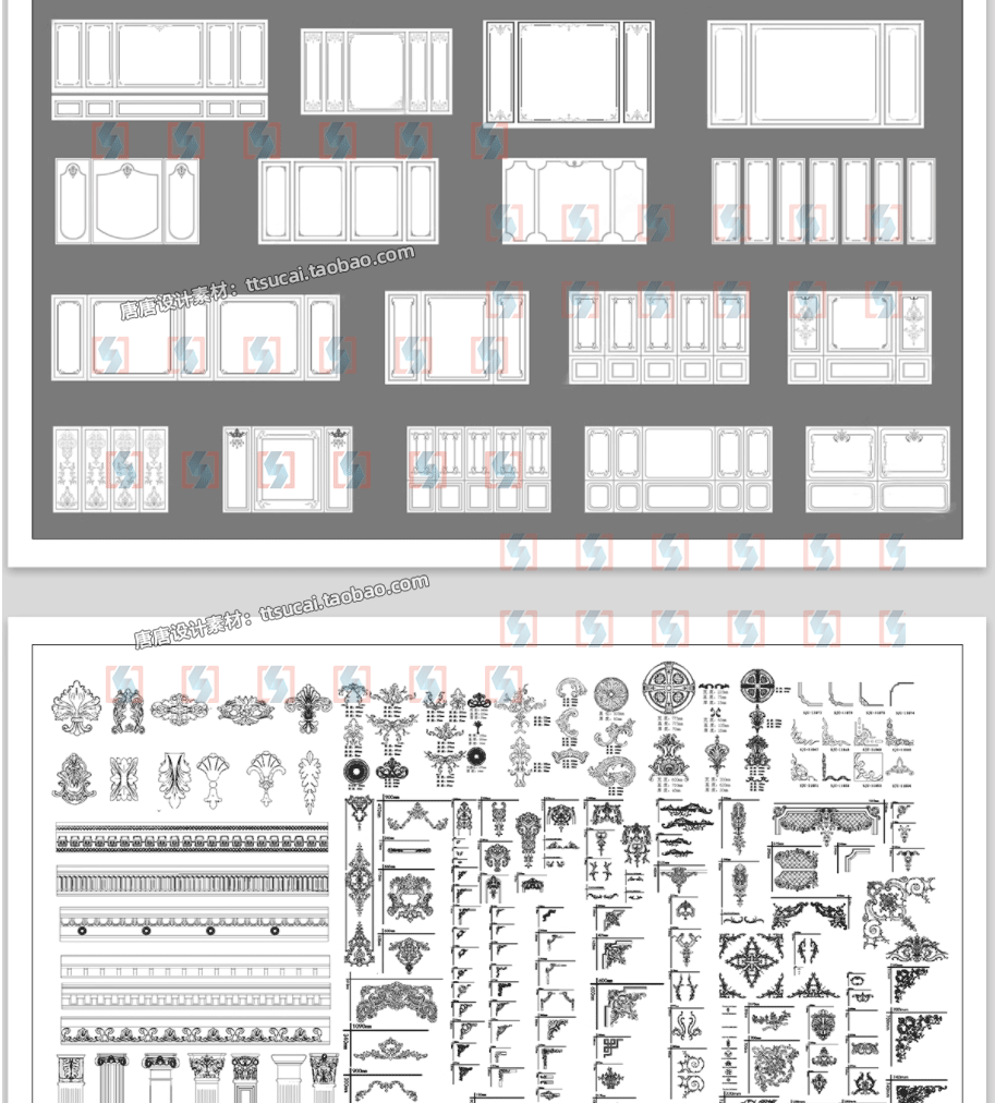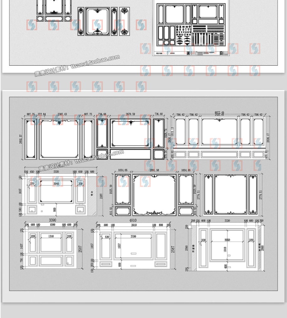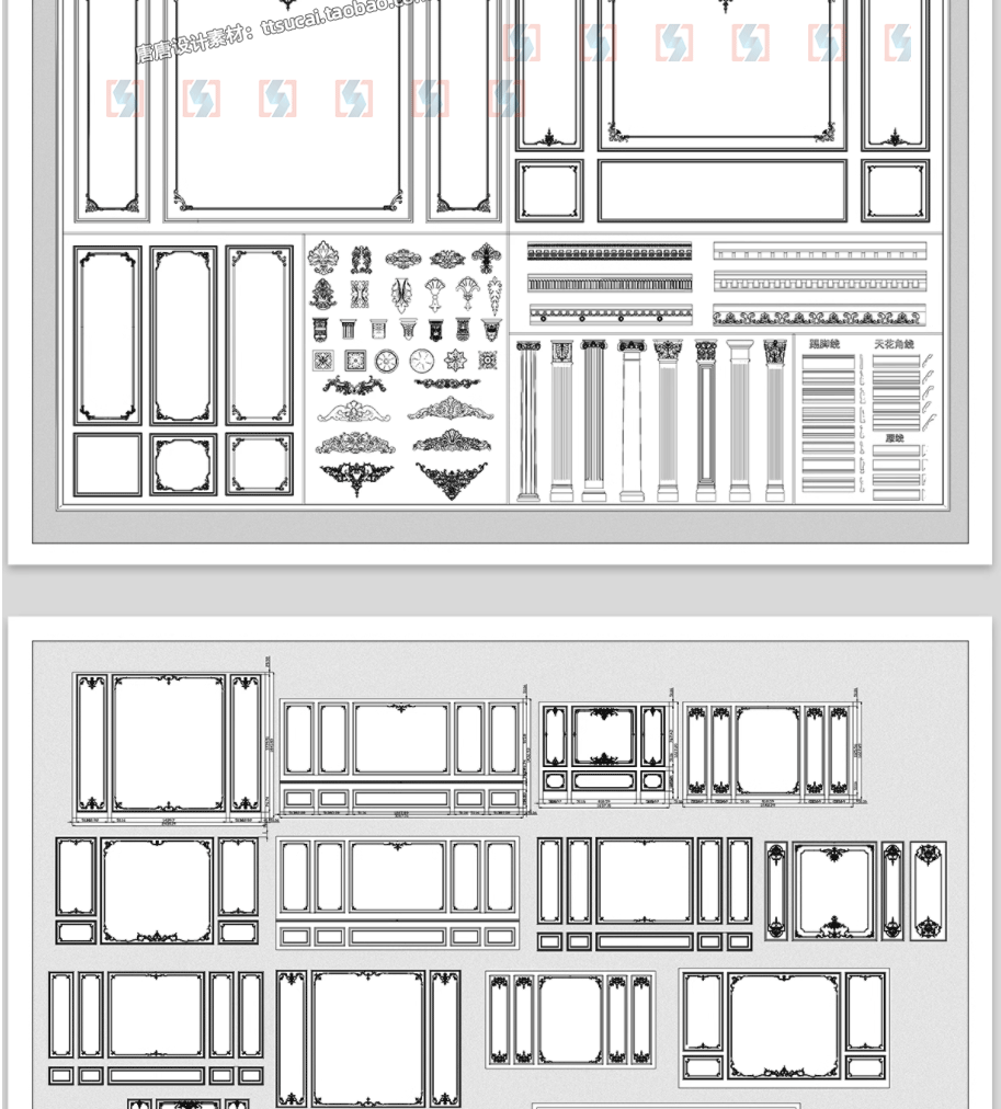 法式巴洛克风格整木护墙板电视沙发背景墙模块cad立剖面施工图纸免费下载