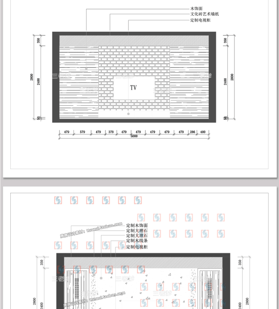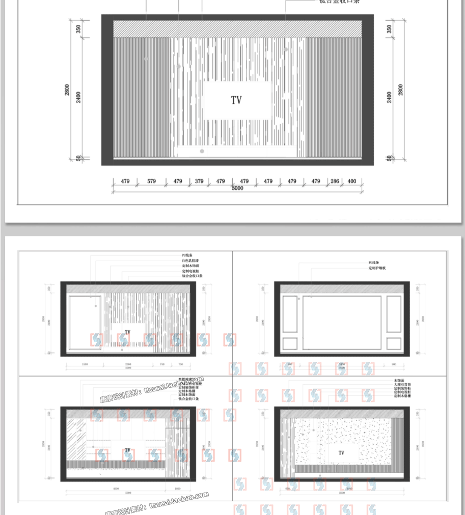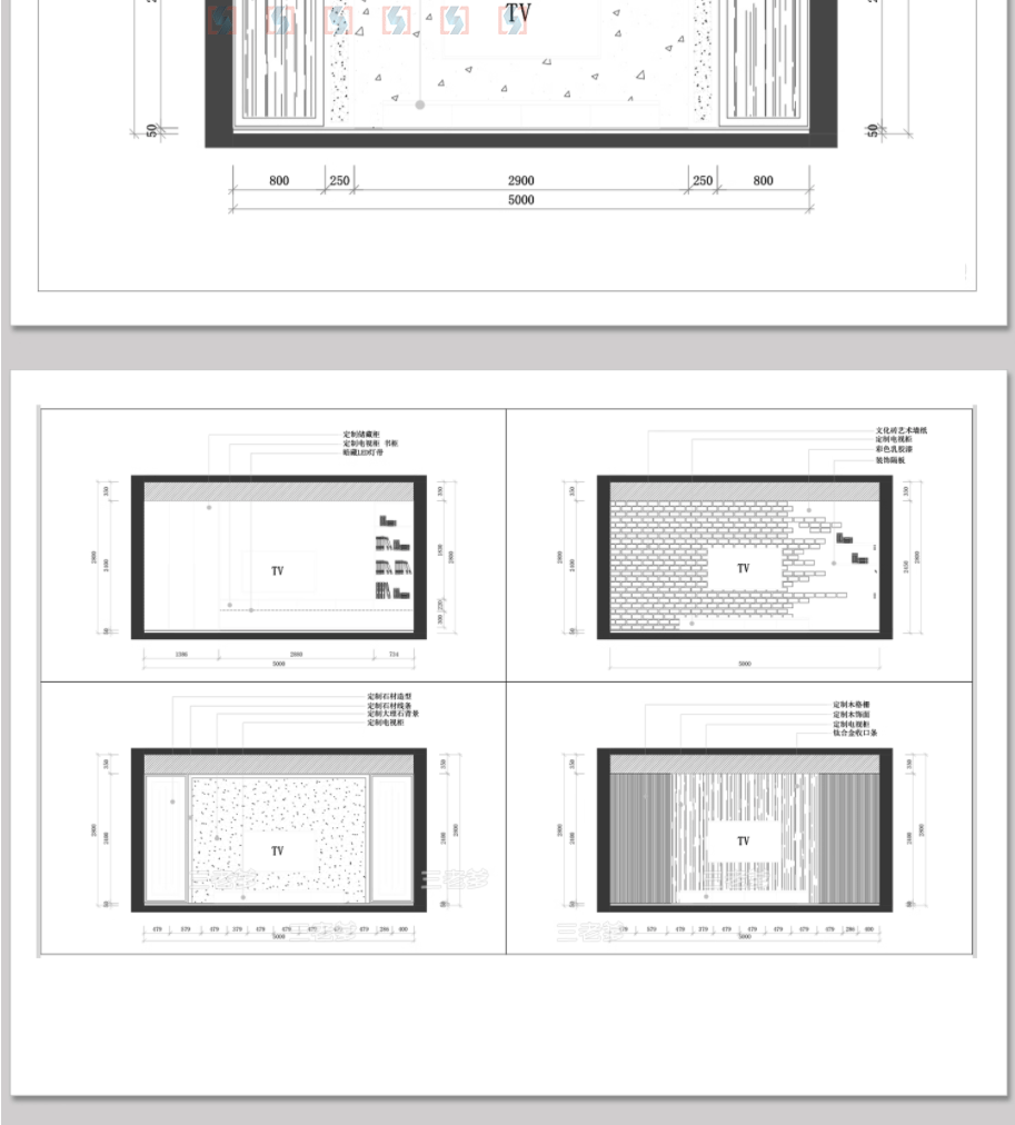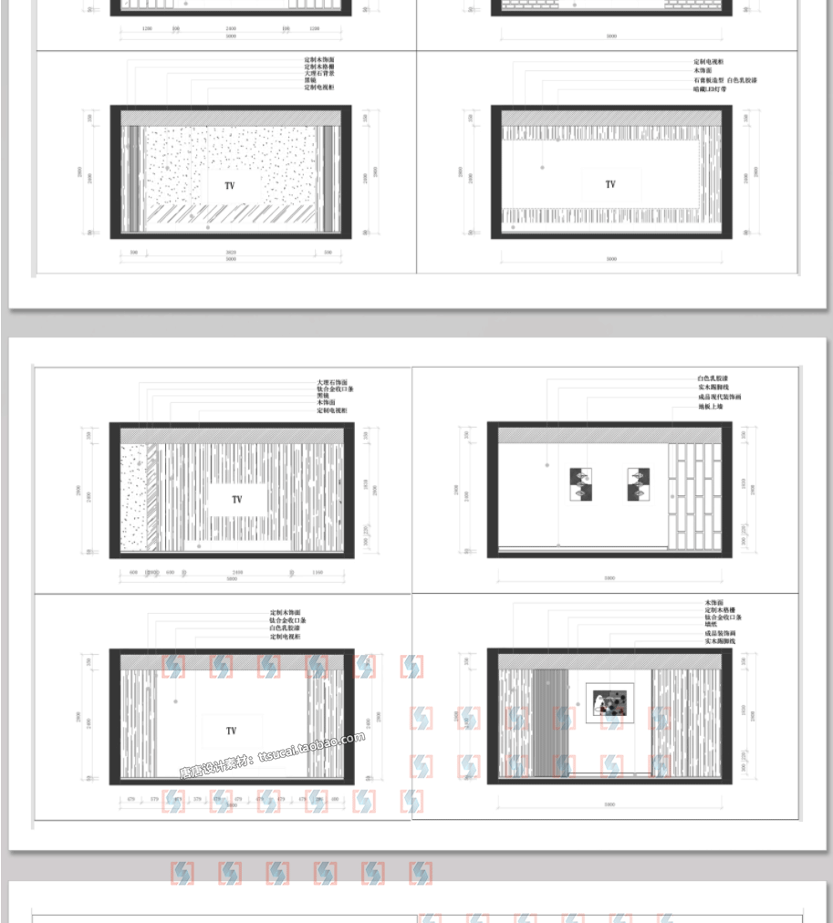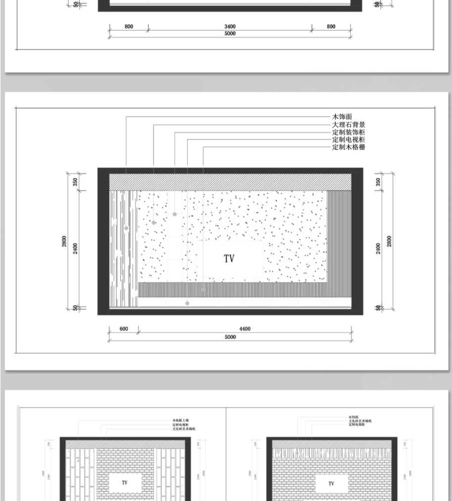 全屋定制电视背景墙CAD施工图 大理石客厅电视墙电视柜木饰面免费下载