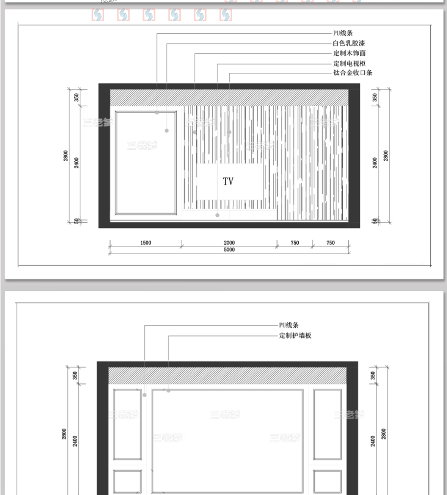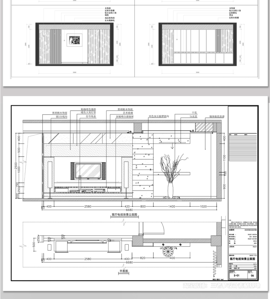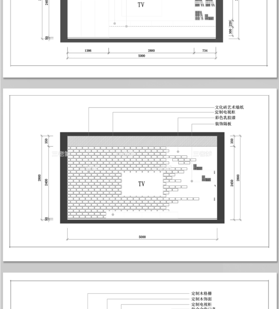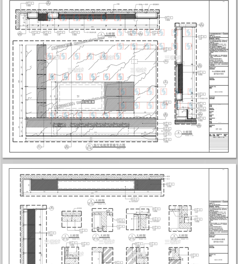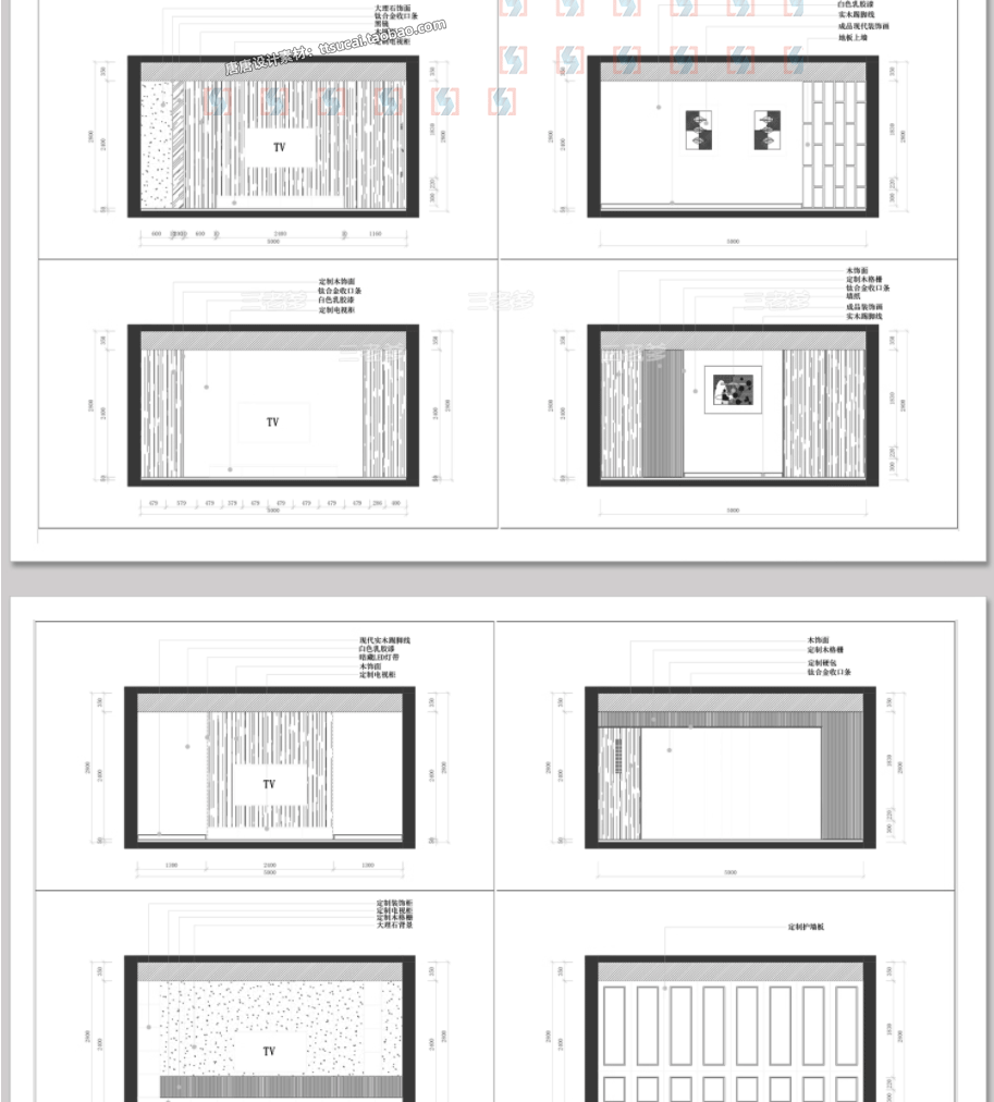全屋定制电视背景墙CAD施工图 大理石客厅电视墙电视柜木饰面免费下载